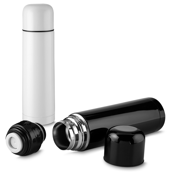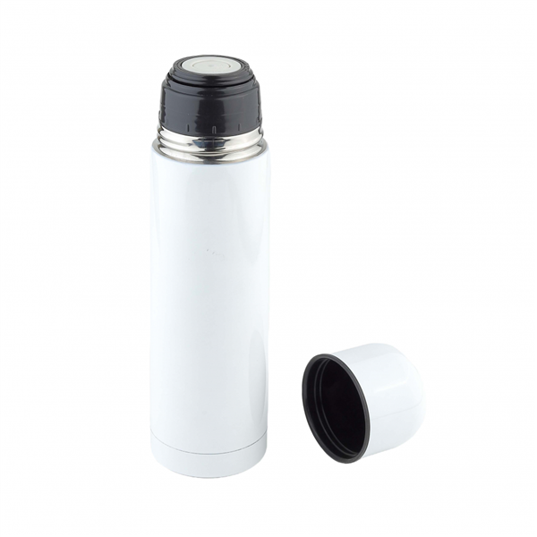 Garrafa em aço inox com parede dupla de 500 ml. Conserva líquido quente por até 4 horas e líquido frio até 6 horas e sua tampa pode ser usada como copo. PERSONALIZADO